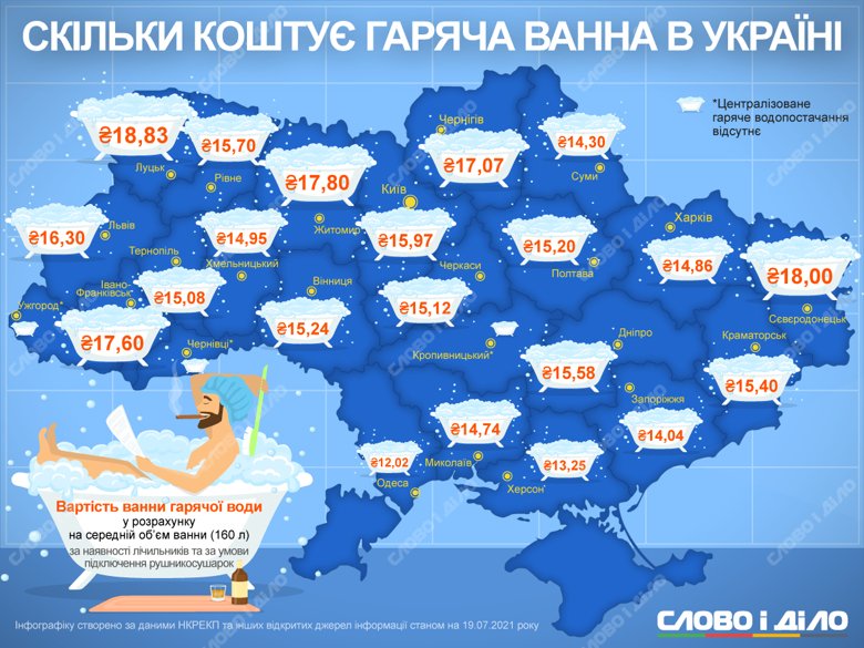 У Сєвєродонецьку (Луганська область) гаряча ванна коштує 18 грн, в Житомирі – 17,8 грн, в Івано-Франківську – 17,6 грн, в Чернігові – 17,07.