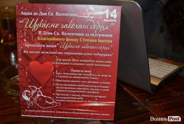 У Луцьку в ресторації «Брама» (“Там-Там”) 14 лютого закохані пили шампанське, писали одне одному освідчення в коханні, багато цілувалися та вигравали призи — благодійний фонд депутата Волинської обласної ради Степана Івахіва організував оригінальну акцію «Шукаємо закохані серця».