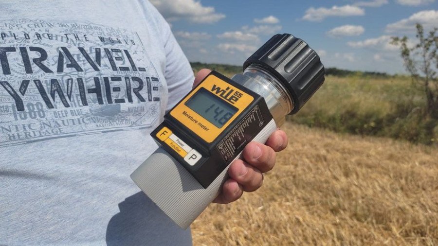 Комбайни у полі молотять до 22 чи 23 години, поки не впаде роса. Зернові культури, які обмолотили, перевіряють на вологість. Фермер Андрій Швець зазначив: вологість зерен вимірюють спеціальним приладом.