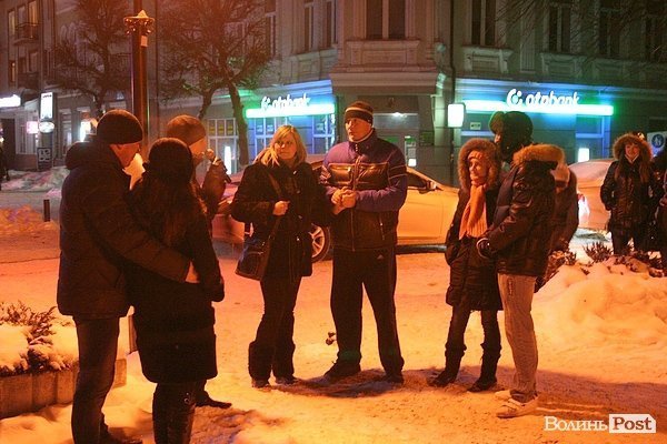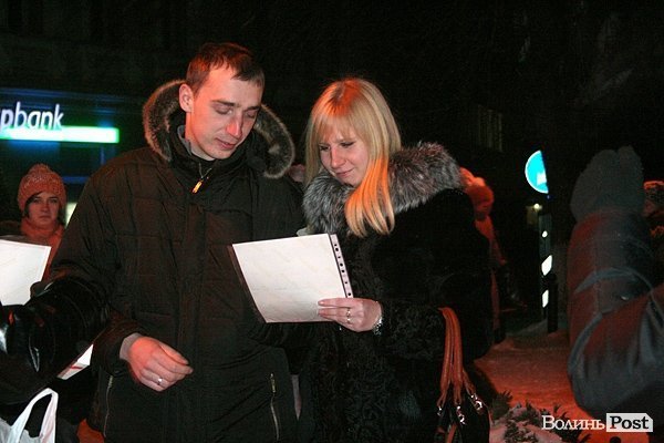 В морозний вечір кілька десятків пар зібралися на символічну акцію, щоб засвідчити привселюдно кохання один до одного. Акцію організував лучанин Сергій Ярмолюк.