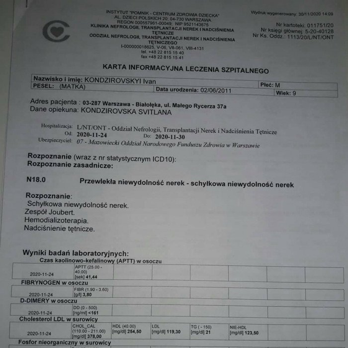 Маленький любомльчанин Іван Кондзіровський, якому всього 10 років, вже рік перебуває на гемодіалізі.