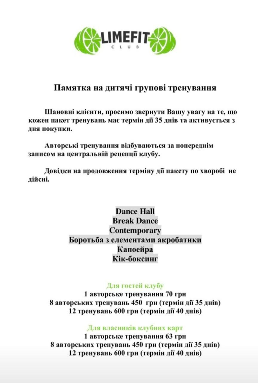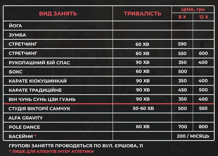 - Ранковий 15 тренувань - 400грн / 1міс (з 7:00 до 16:00);