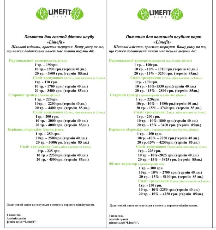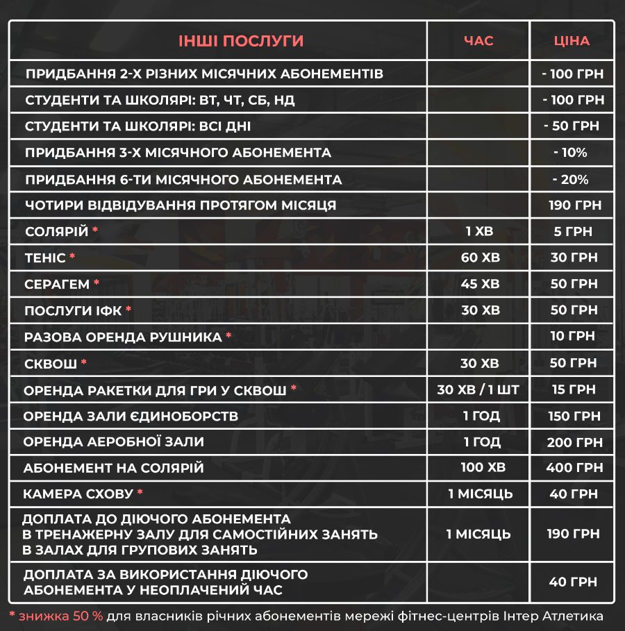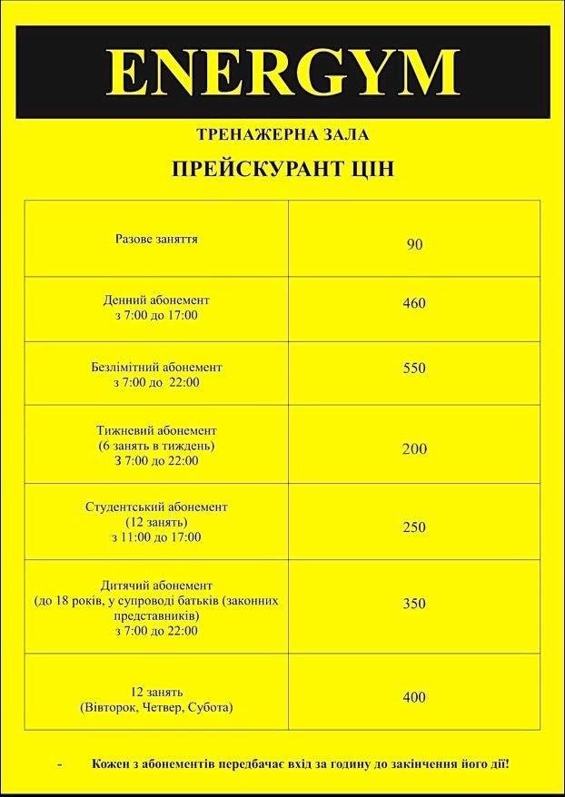 Разове відвідування тренажерного залу коштує 200 гривень. Написання індивідуально-адаптованої програми - 200 гривень. Персональні заняття з тренером - 900-1 700 гривень на місяць. Абонемент в тренажерний зал «Безлімітний» - 550 гривень на місяць. Абонемент в тренажерний зал «Денний» (з до 7 до 17 години) - 490 гривень на місяць. Абонемент в тренажерний зал «Студентський» (з до 7 до 17 години) - 370 гривень на місяць. Абонемент в тренажерний зал «Економ» (з до 7 до 17 години) - 400 гривень на місяць. Абонемент в тренажерний зал «Нічний» (з до 20 до 22 години) - 400 гривень на місяць. Абонемент в тренажерний зал «Безліміт на 1 тиждень» - 200 гривень. Абонемент в тренажерний зал «Безліміт на 2 тижні» - 300 гривень.