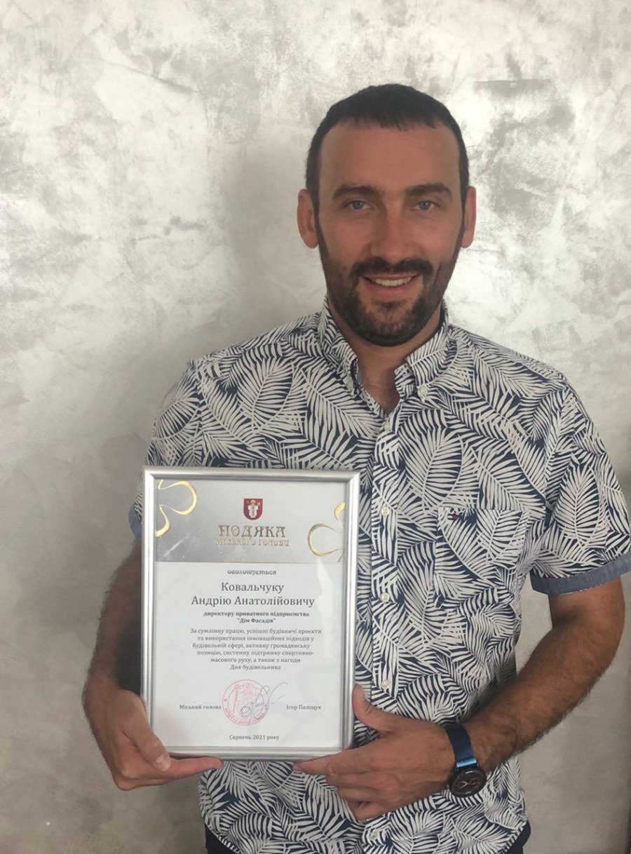 Днями у Луцьку відбулися урочистості до Дня будівельника. Луцький міський голова Ігор Поліщук нагородив найкращих майстрів своєї справи у місті. Серед них – і генеральний директор будівельної компанії «Дім Фасадів» Андрій Ковальчук.