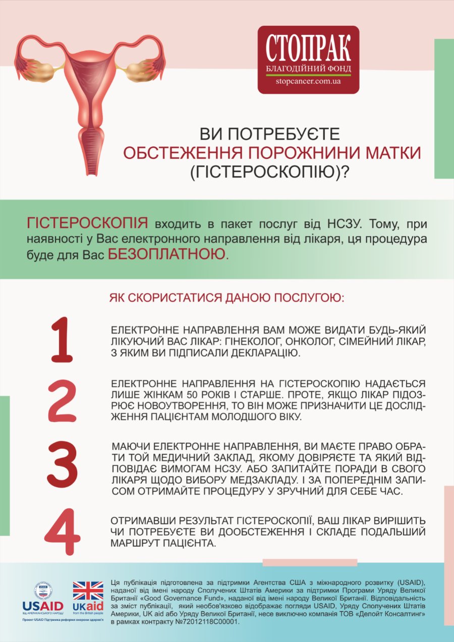 Зокрема, інформують, що Програмою медичних гарантій в Україні передбачені 6 інструментальних досліджень для виявлення таких захворювань – мамографія (обстеження молочних залоз), гістероскопія (обстеження порожнини матки і цервікального каналу ), езофагогастродуоденоскопія (обстеження стравоходу, шлунку та дванадцятипалої кишки), колоноскопія (обстеження прямої кишки, товстої кишки та термінального відділу тонкої кишки), цистоскопія (обстеження уретри, сечового міхура і вічок сечоводі) та бронхоскопія (обстеження дихальних шляхів).