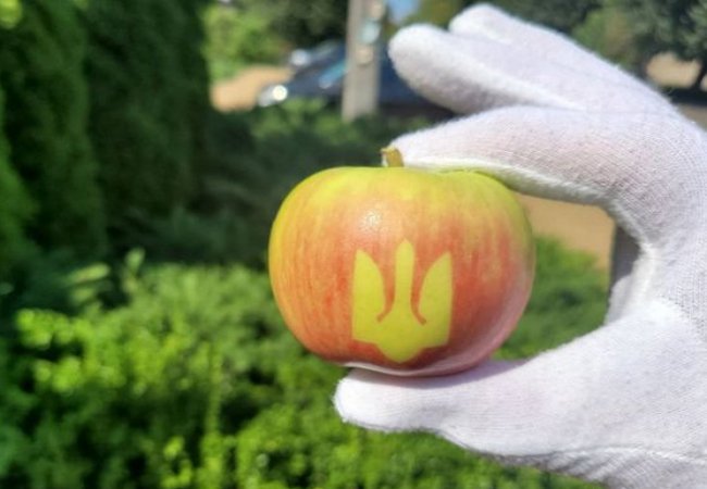 Коли плоди почали дозрівати, наліпили на них наклейки-трафарети у формі тризуба. Перший раз не вийшло, бо яблука наливалися, а наклейки залишалися і псували фрукт. Тому вдруге замовили наклейки з матеріалу, який розтягується, — тепер яблука дозрівають разом із наклейкою. За патріотичними фруктами вже стоїть черга — їх спеціально замовляють на фруктові композиції та подарунки до свята.