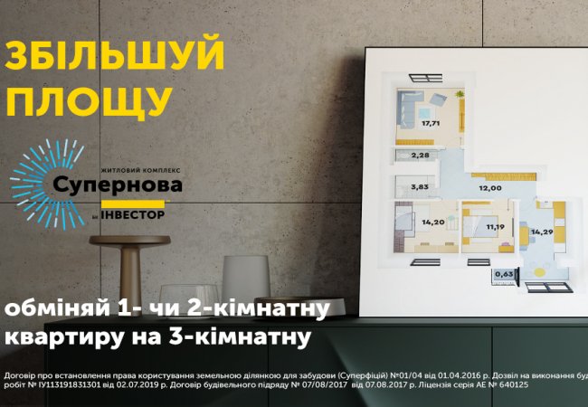 Для власників 1- та 2-кімнатних квартир у “великому” будинку ЖК “Супернова” діє акція. Забудовник пропонує обмін меншого житла на 3-кімнатні квартири.