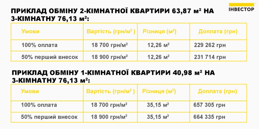 Доплата буде здійснюватись за ціною від 18 700 грн/м2. Також можливі варіанти обміну житла з розтермінуванням на 23 місяці, інформують на сайті Будівельної компанії "Інвестор".