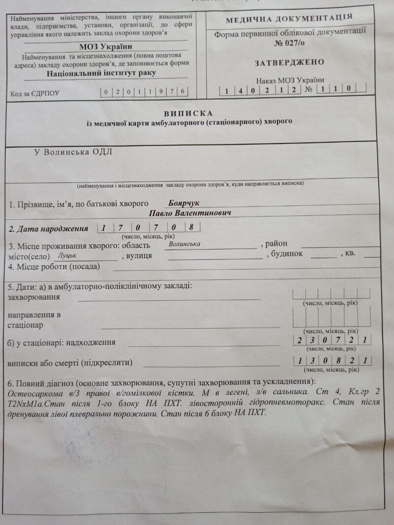 Павло вже пройшов 6 курсів хіміотерапії. Попереду чекає перша операція, під час якої заберуть пухлину і пошкоджену кістку, зафіксують ногу металевою конструкцією та видалять метастази у легенях. Ця операція обійдеться орієнтовно у 30 тисяч гривень.