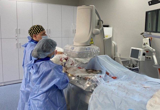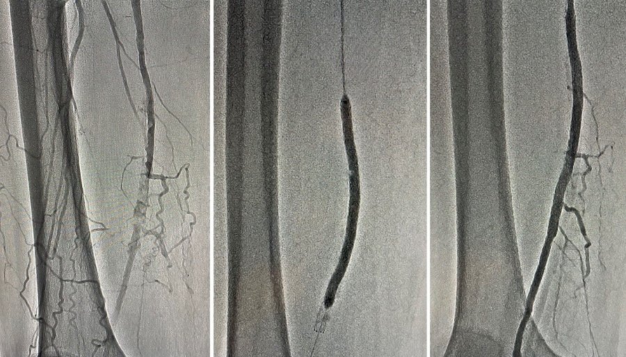 Після проведення ангіографії нижніх кінцівок діагностовано субоклюзію та оклюзію дистальних відділів поверхневих стегнових артерій - 100% і 98%. Команда ендоваскулярних хірургів провела стентування обох артерій через проколи в паху.