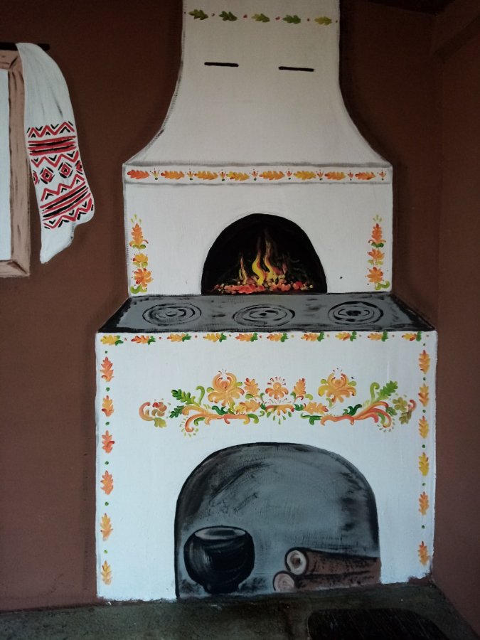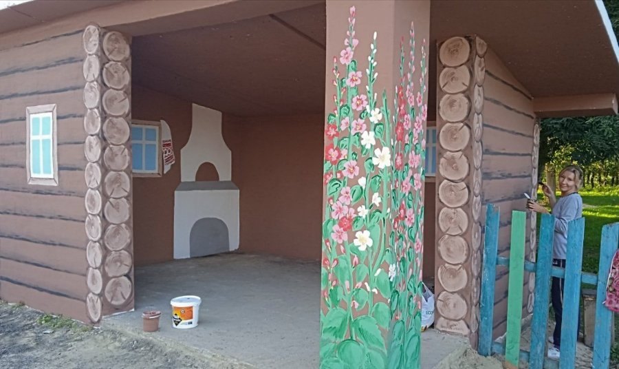 «Ми хотіли зробити, щоб було не так, як в усіх. Тож я це уявляла, як сільський будинок із мальвами, віконцями. Всередині тут є все, як у справжній сільській хатині, - піч, полички із глечиками й іншим посудом, українські вишиті рушники. Ці всі елементи ми дружно малювали впродовж кількох днів. Якраз повезло нам і з погодними умовами, тож фарба на сонечку швидко висихала», - розповідає пані Іванна.