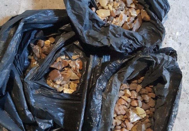 У підсобному приміщенні фігуранта правоохоронці виявили три пакети із камінням різного розміру, ззовні схожим на бурштин, вагою понад пів кілограма.