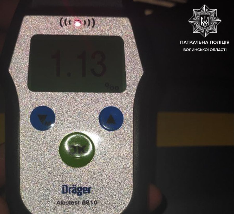 Керманич погодився пройти огляд на визначення стану алкогольного сп’яніння на місці зупинки. Результат — 1,13 проміле, що в 5 разів перевищує допустиму норму.