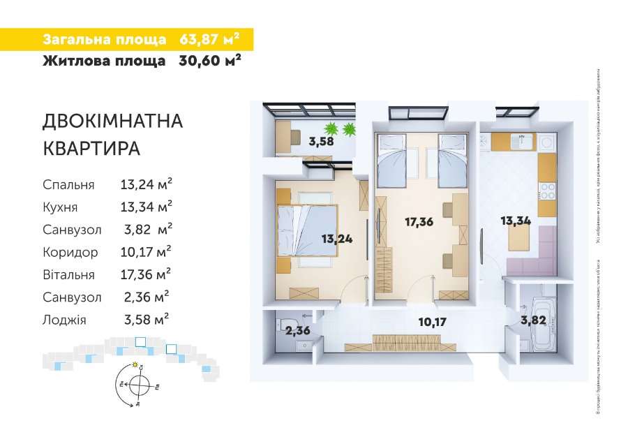 2) Остання 2-кімнатна квартира 63,87 м2. Ця квартира розташована в 5 під’їзді, вікна виходять на східний бік, тобто - на Ботанічний сад. В квартирі окремий просторий коридор, дві кімнати, лоджія із виходом у спальню та роздільний санвузол.