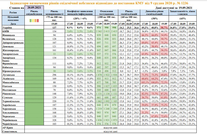 Станом на 20 вересня в 11 регіонах України перевищений показник рівня госпіталізації хворих з коронавірусом. Загалом по всій країні динаміка Соvid-госпіталізованих пацієнтів складає 50,7%, що також уже - більше норми.