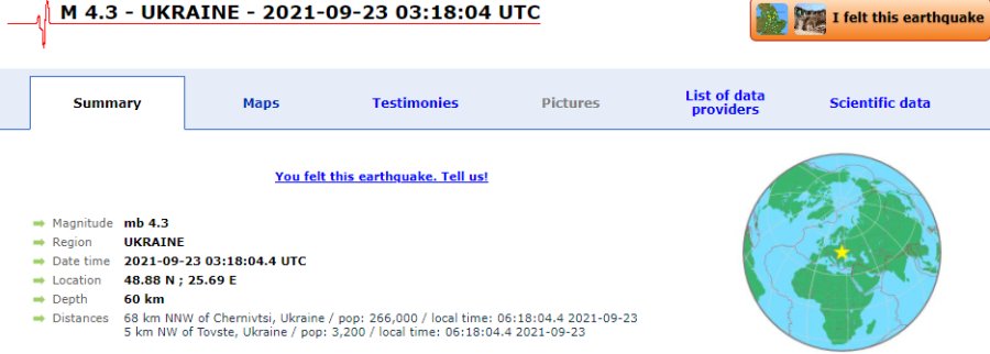 Підземні поштовхи відчули сьогодні зранку, 23 вересня, жителі України у Тернопільській, Хмельницькій, Вінницький областях і Чернівецькій областях.