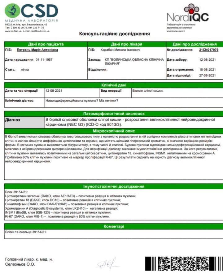 Марія Антонівна у відчаї. Вона живе на 2 000 гривень пенсії. Гроші збирала синові, навіть збиралась їхати до Польщі на роботу. Але в серпні в Нововолинській лікарні у неї виявили каміння в нирках. На дообстеження її направили в Луцьк, де і діагностували пухлину в сліпій кишці, яка дала метастази в печінці та легенях.