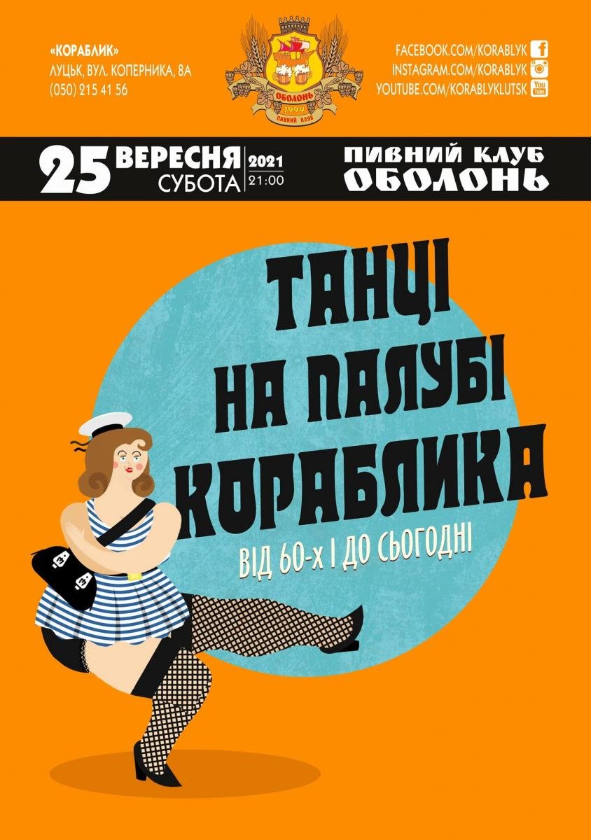 О 21 годині у пивному клубі «Оболонь» (вулиця Коперника 8а) проведуть вечірку «Танці на палубі «Кораблика»: від 60-х і до сьогодні». Вхід: 30 гривень.