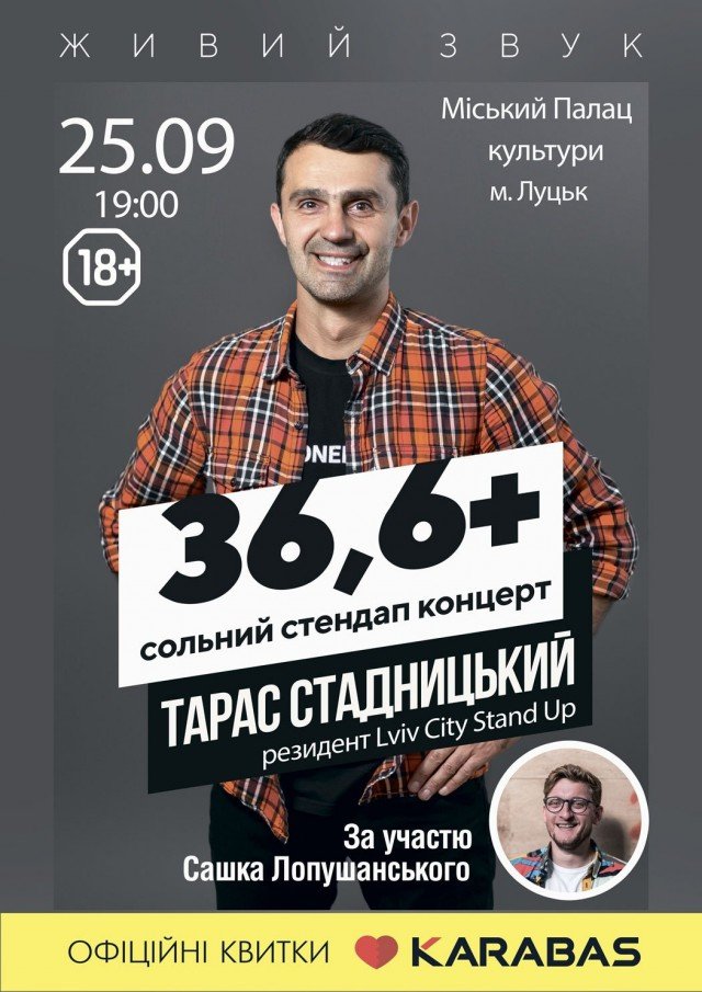 О 19 годині у Палаці культури міста Луцька (вулиця Богдана Хмельницького, 1) відбудеться сольний StandUP «36,6+» Тараса Стадницького.