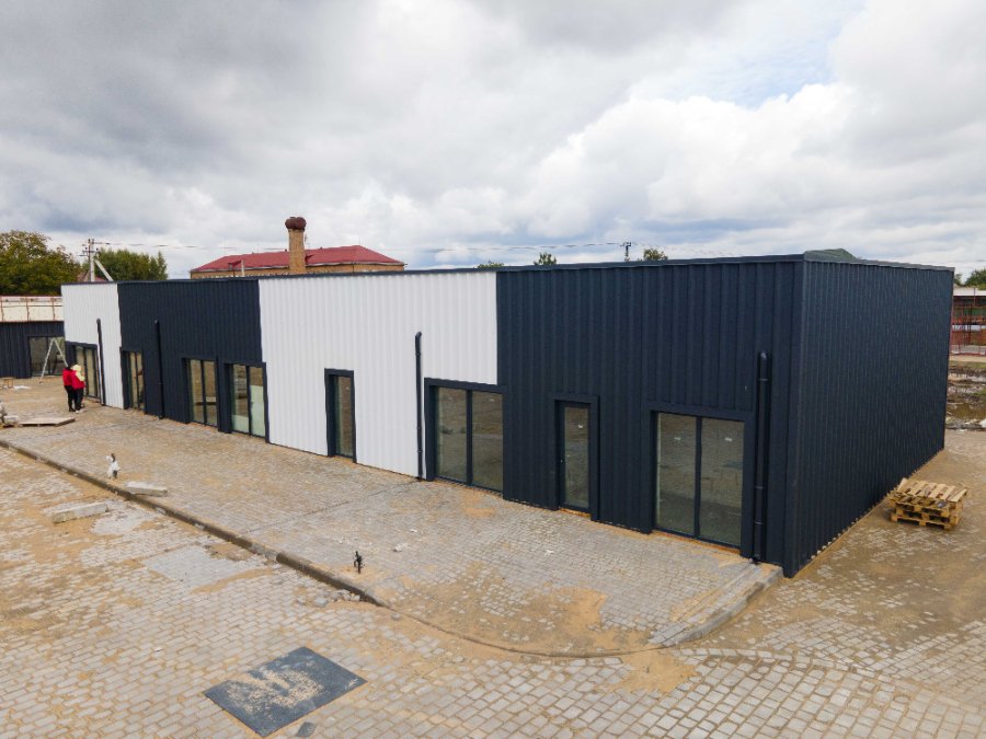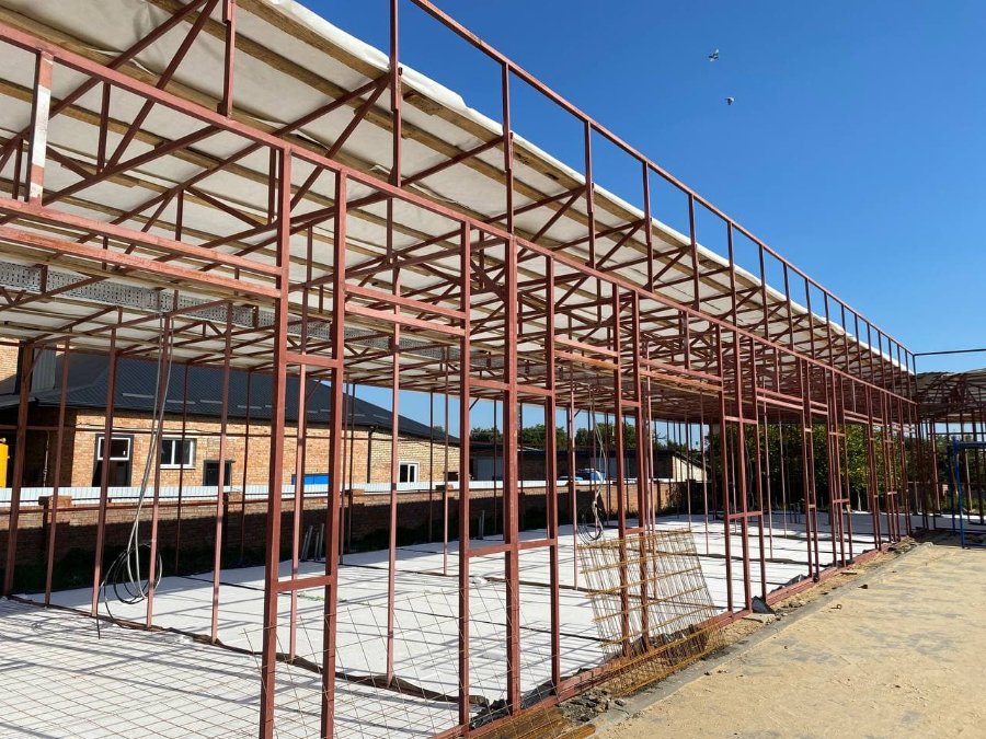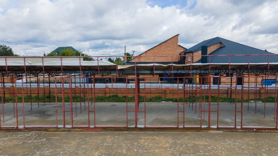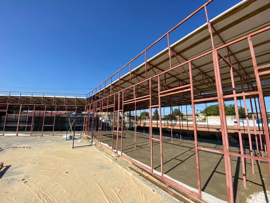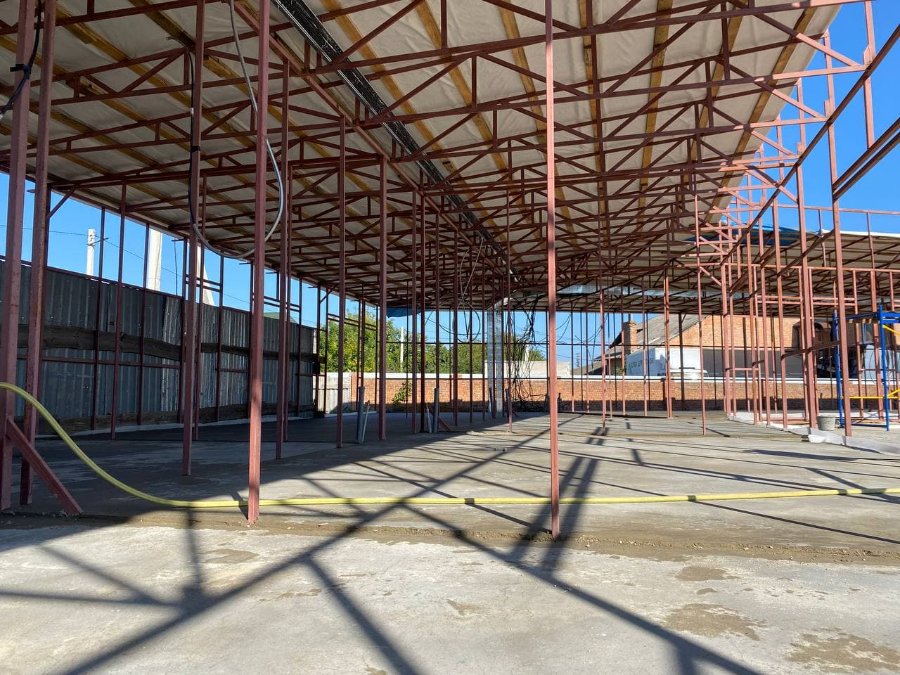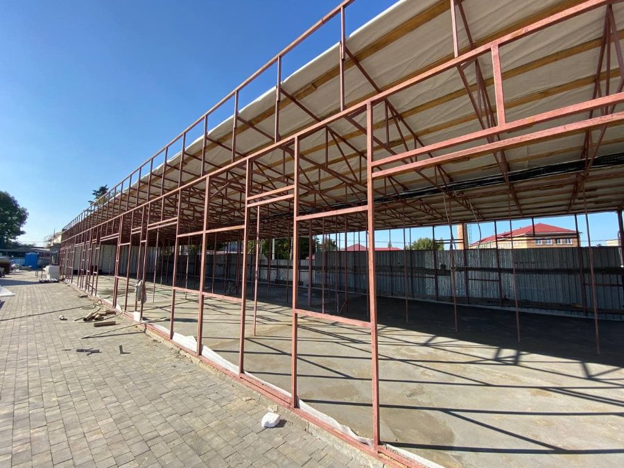 - змонтовані металеві каркаси для усіх торгових павільйонів, споруджене накриття, залита стяжка, половина фасадів обшита металопрофілем;
