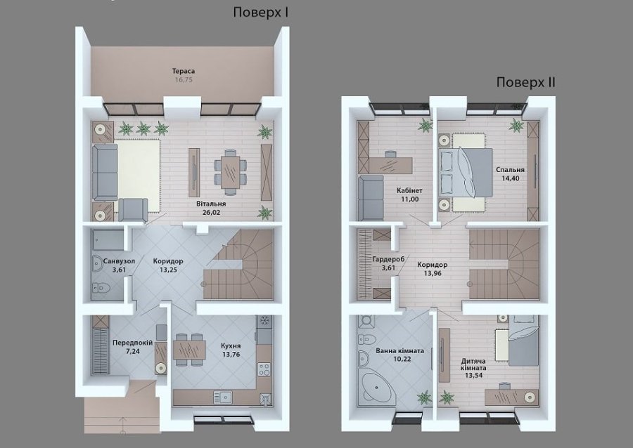На першому поверсі - простора вітальня із виходом на засклену терасу, окрема кухня та санвузол. На другому поверсі - дві спальні, кабінет, велика ванна кімната та гардероб.
