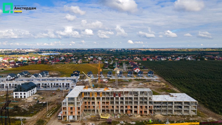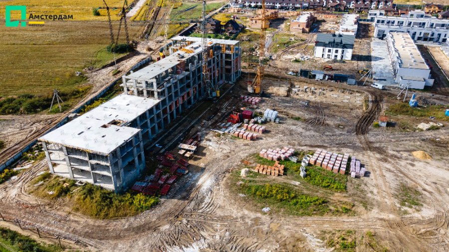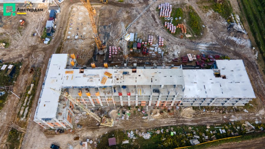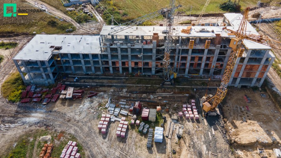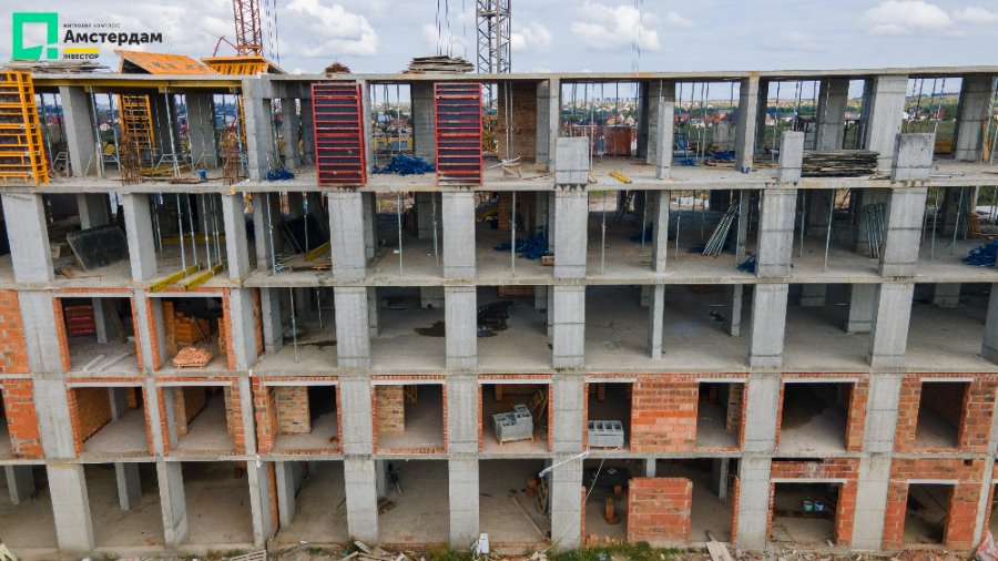 Наразі завершується спорудження монолітного каркасу у першій черзі «Амстердама» (це - перші три під’їзди). Роботи уже ведуться на верхньому поверсі.