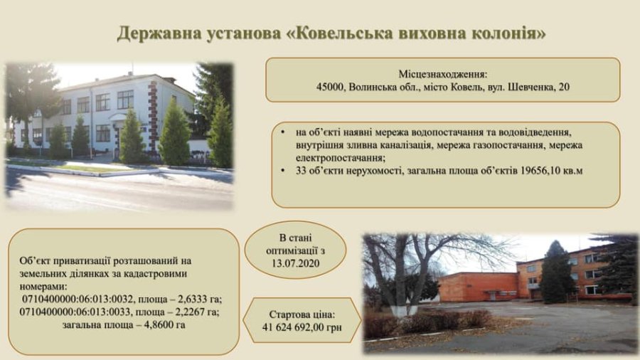 Колонія знаходиться за адресою вул. Шевченка, 20 у місті Ковель. І її стартова ціна - 41 624 692 грн.