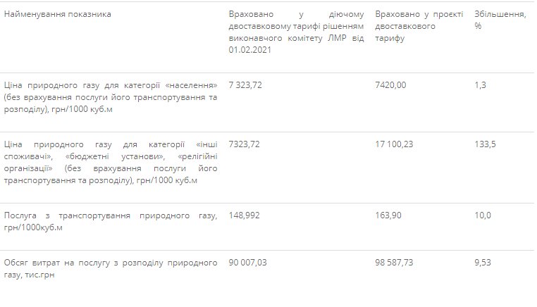 Порівняльна таблиця цін на природний газ, послуги з його розподілу та транспортування, які враховані у чинних та проєктах тарифів ДКП «Луцьктепло»: