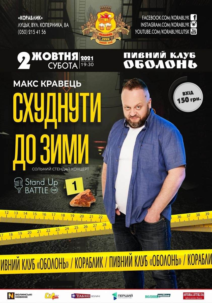 О 19:30 у пивному клубі «Оболонь» (вулиця Коперника 8а) запрошують на сольний стендап-концерт «Схуднути до зими» Макса Кравця. Вартість квитка: 150 гривень.