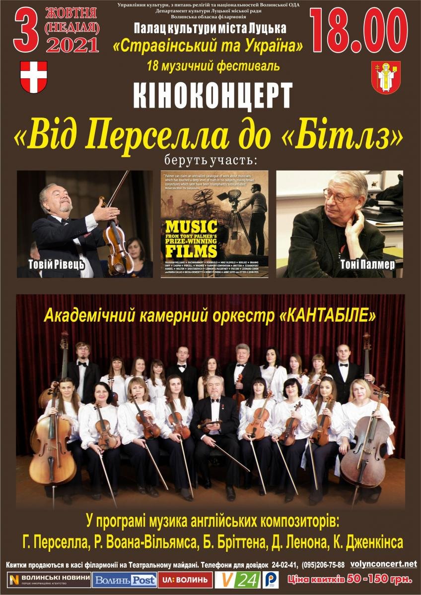 О 18 годині у Волинській обласній філармонії запрошують на кіноконцерт «Від Перселла до «Бітлз». Захід за участі видатного британського кінорежисера Тоні Палмера та Академічного камерного оркестру «Кантабіле» Волинської обласної філармонії (диригент - народний артист України Товій Рівець). Вартість квитків: 50-150 гривень.
