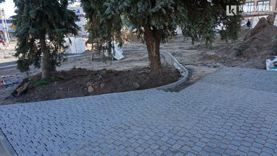 Навколо площі продовжують встановлювати бордюри і розділяти територію на запроектовані зони.