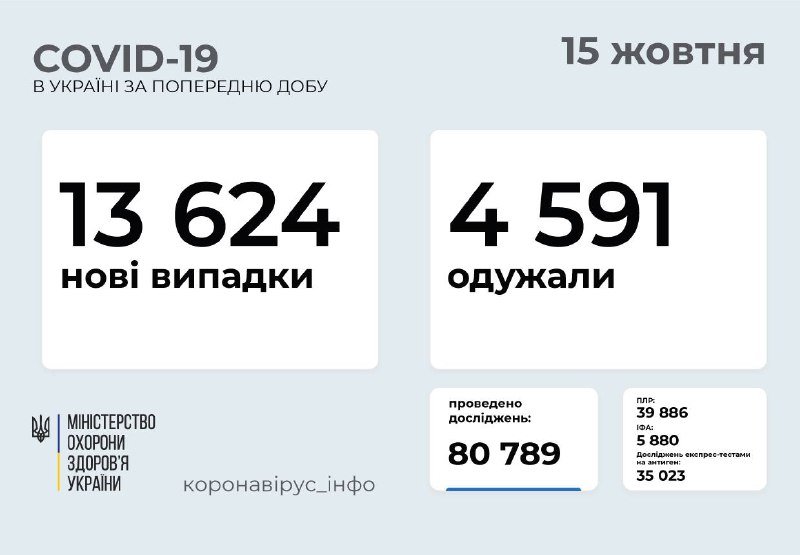 13 624 нові випадки COVID-19 зафіксували в Україні станом на 15 жовтня 2021 року.