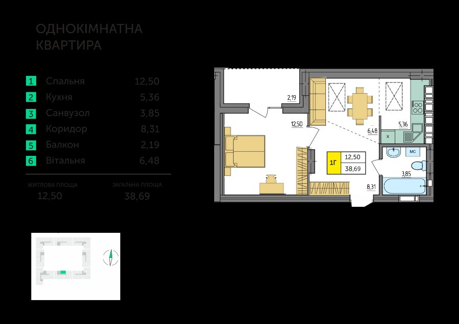 КВАРТИРА 38,69 м2 З ОДНІЄЮ СПАЛЬНЕЮ