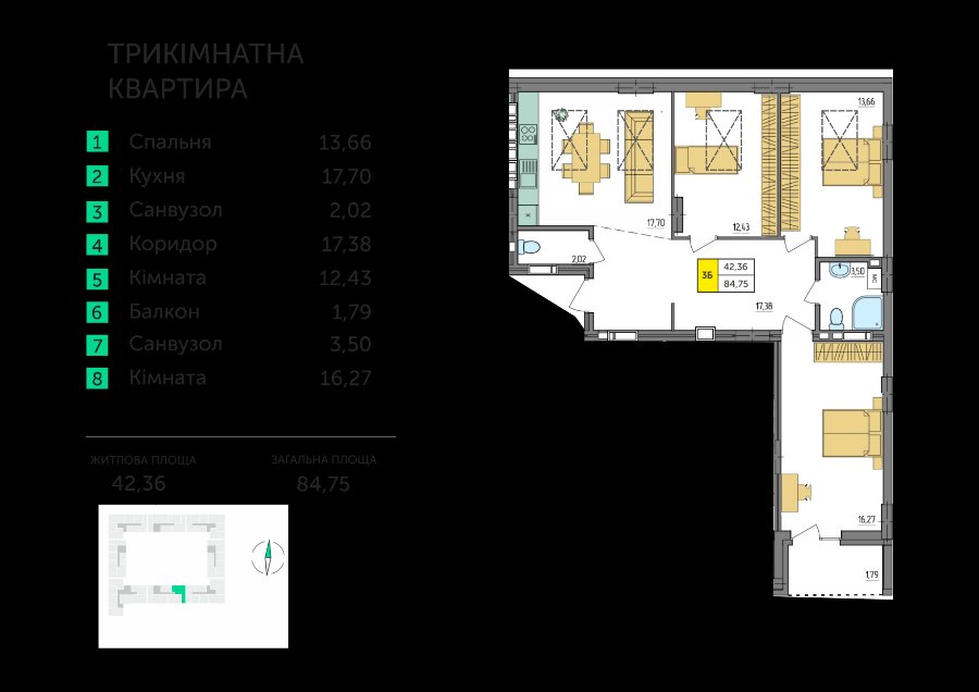 КВАРТИРА 84,75 м2 ІЗ ТРЬОМА СПАЛЬНЯМИ