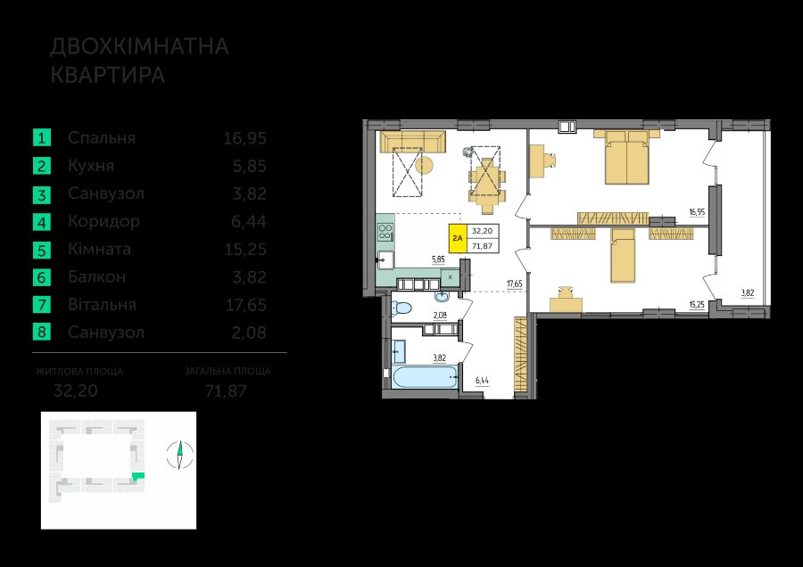 КВАРТИРА 71,87 м2 ІЗ ДВОМА СПАЛЬНЯМИ