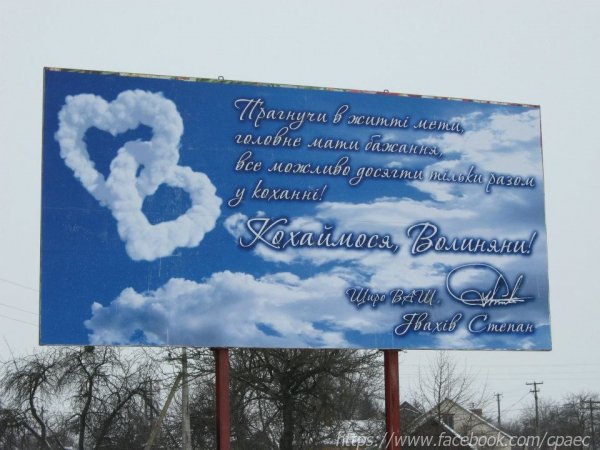 Перше фото білборду уже з'явилось у альбомі. На ньому із закликом до волинян кохатися звернувся депутат Волинської обласної ради, співвласник групи компаній «Континіум», мільйонер і меценат Степан Івахів.