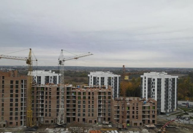 Два під'їзди “великого” будинку уже повністю змуровані, тривають фасадні та внутрішні будівельні роботи. Зокрема, у відео можна побачити, як майстри заливають стяжку підлоги і покривають штукатуркою стіни, а директор компанії під час запису блогу вирішив перевірити якість виконаних робіт.