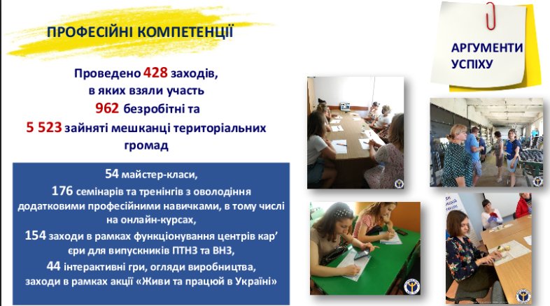 У рамках реалізації програми фахівці служби зайнятості організовували круглі столи та робочі зустрічі, брали участь у розробці стратегії розвитку ТГ, проводили ярмарки вакансій, тренінги, семінари, профконсультації. Окрім того, здійснювали професійну орієнтацію учнівської молоді на здобуття затребуваних на ринку праці професій та спеціальностей, актуальних для конкретної громади.