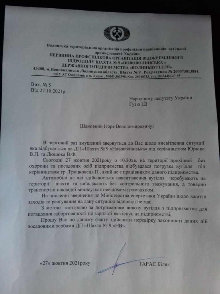 У зверненні зазначають, що 27-го жовтня на території прохідної без охорони та посадових осіб підприємства відбулося завантаження автомобіля вугіллям під керівництвом Троцковця П., який не є працівником шахти.
