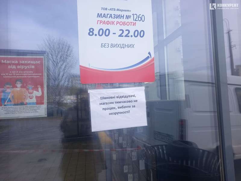 Вхід до магазину перекритий червоно-білою стрічкою, а на дверях висить аркуш паперу з вибаченнями за незручності.