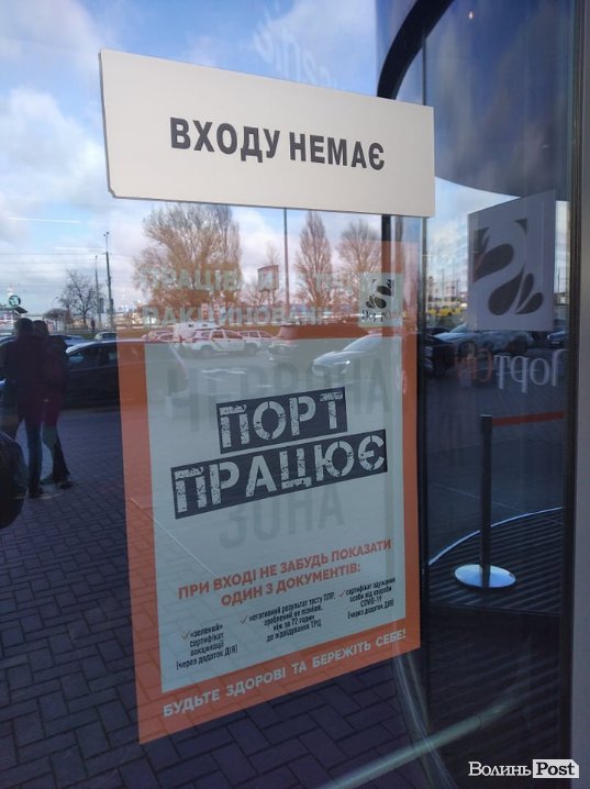 Тож, спочатку приїхали у ТРЦ «ПортСіті». Тут, як і повідомляли виданню раніше, на вході у нас запитали про наявність ковід-документів. На дверях до ТРЦ розмістили інформацію про нові правила для відвідувачів.