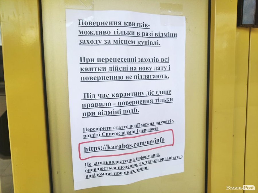 Додамо, що під час «червоної» зони заборонені масові заходи, зокрема – концерти. Тож на вході до драмтеатру відвідувачів інформують про те, як і де перевірити, чи подію скасували, повернути квиток тощо.