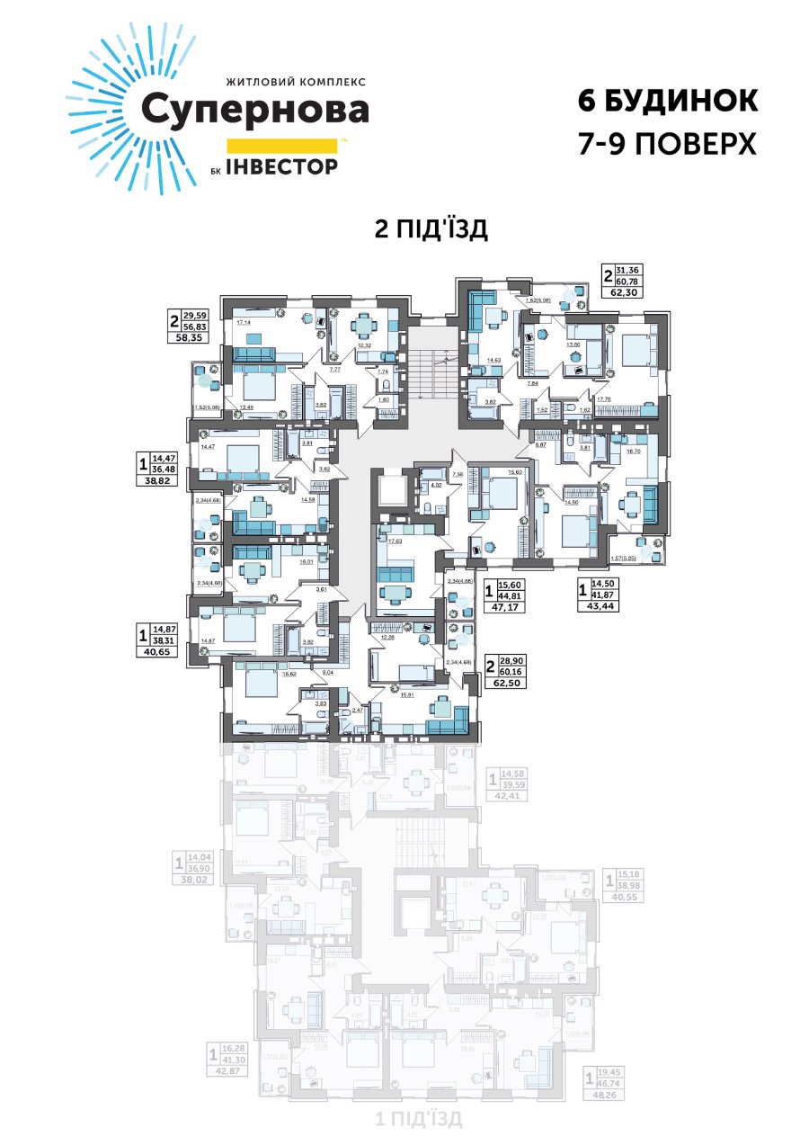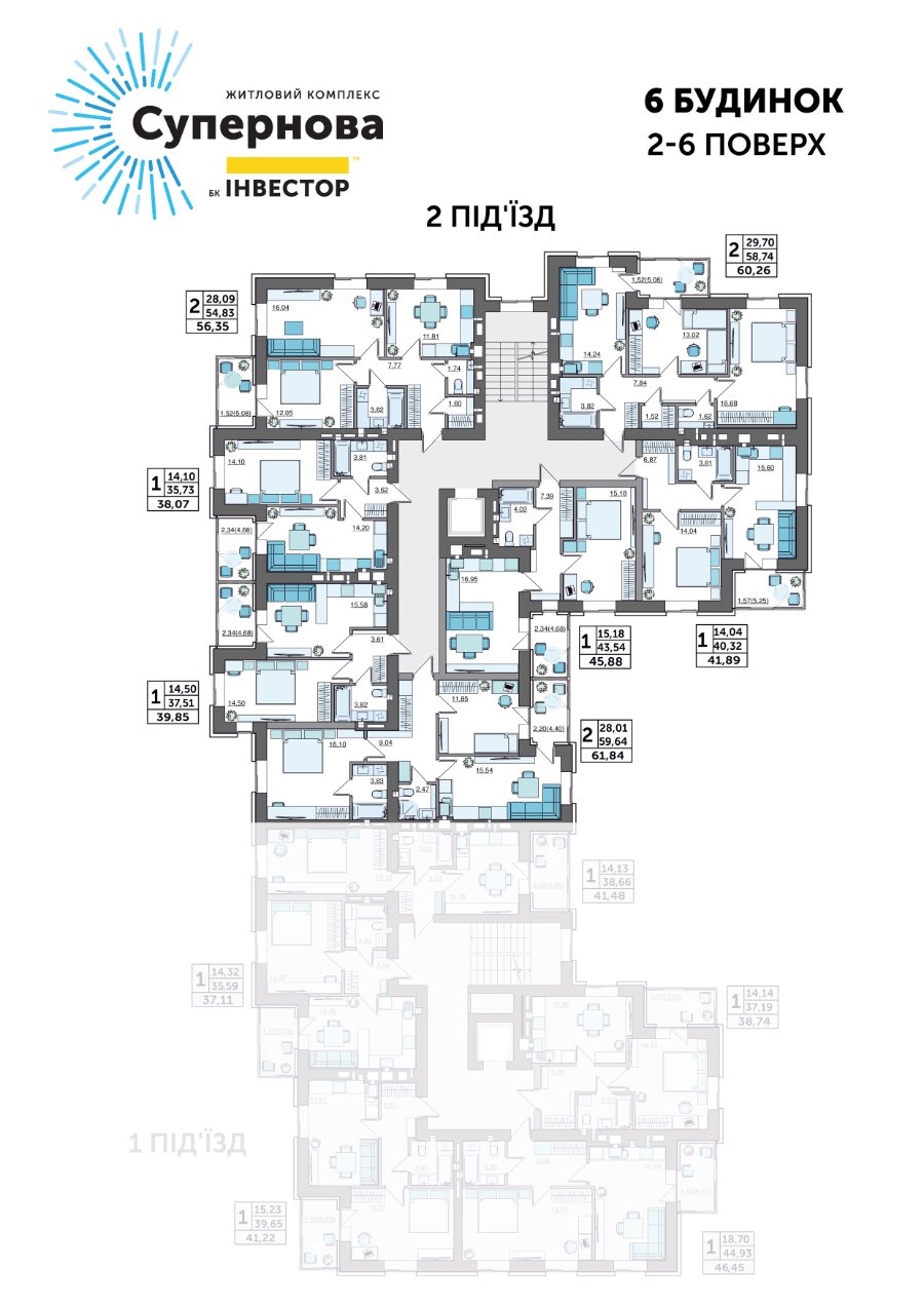- Площа 2-кімнатних - від 56,35 м2 до 62,5 м2.