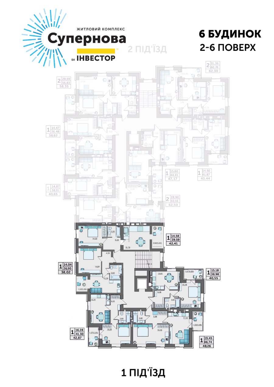 - Площа 1-кімнатних - від 37,11 м2 до 48,26 м2.