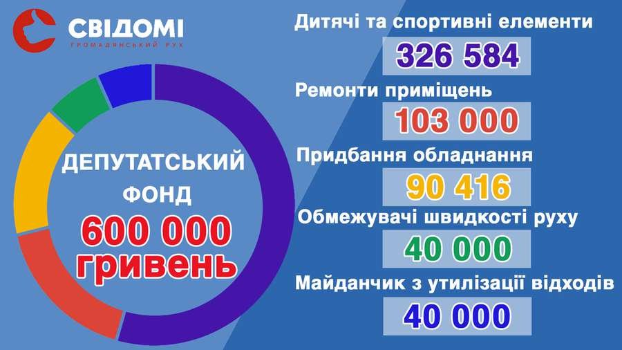 Фракція «Громадянський Рух «СВІДОМІ» вирішила концептуально підійти до питання розподілення коштів депутатського фонду. Тож обранці громади об’єднали всі гроші з депутатських фондів та запропонували лучанам самостійно вирішувати, як витратити 600 тисяч гривень.