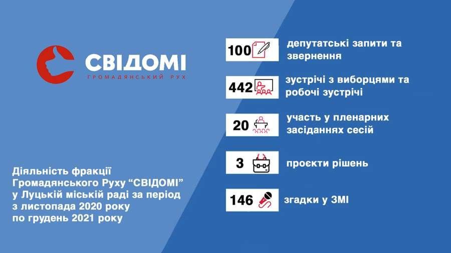 Окрім активної роботи з виборцями, впродовж року «СВІДОМІ» також ефективно працювали й в міській раді. Зокрема, депутати фракції напрацювали три проєкти рішень, які розглянула і підтримала Луцькрада.