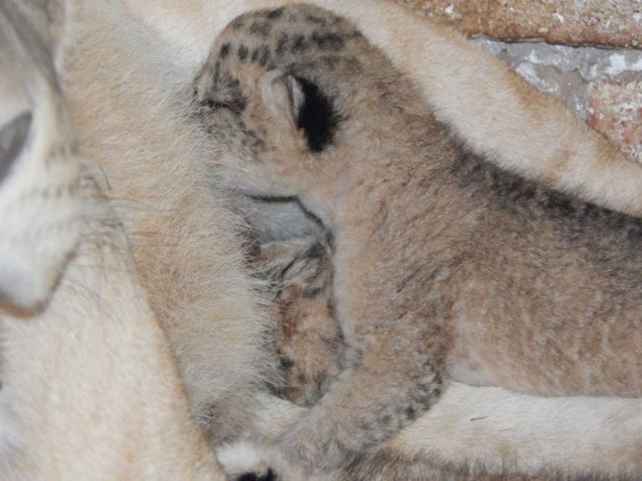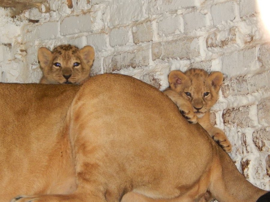 Левенята. Народилися 13-го липня у левиці Даші та лева Ніка. На цьому фото Даша вперше винесла малят із будиночка. Якраз через два тижні після народження левенят.
