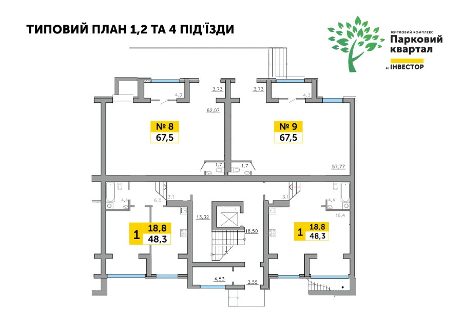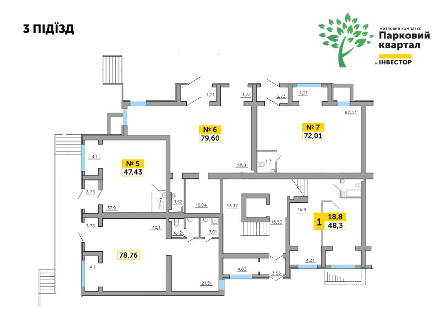 На вибір є приміщення площею від 48,3м2 до 79,6м2. В усіх є окремий гарно облаштований вхід та санвузол.