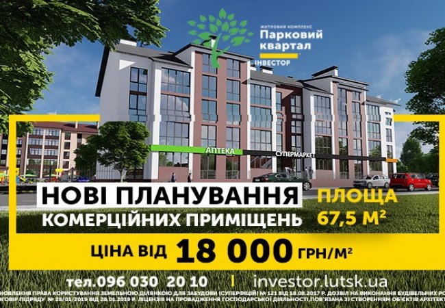 У ЖК “Парковий квартал” (м. Ковель) пропонують комерційні приміщення під магазин чи офіс на першому поверсі нового будинку. Ціна - від 18 000 грн/м2.