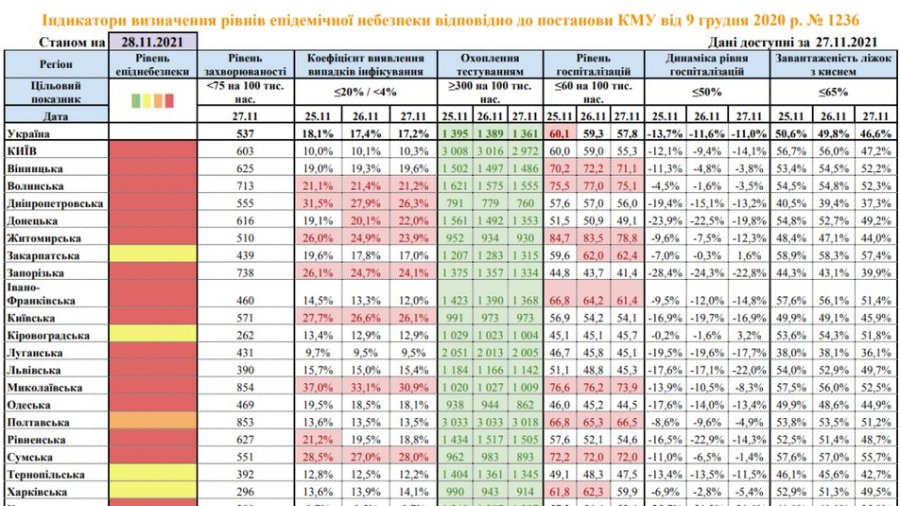 У "червоній" зоні продовжують перебувати: Київ, Вінницька, Волинська, Дніпропетровська, Донецька, Житомирська, Запорізька, Івано-Франківська, Київська, Луганська, Львівська, Миколаївська, Одеська, Рівненська, Сумська, Херсонська, Хмельницька, Черкаська, Чернігівська області.